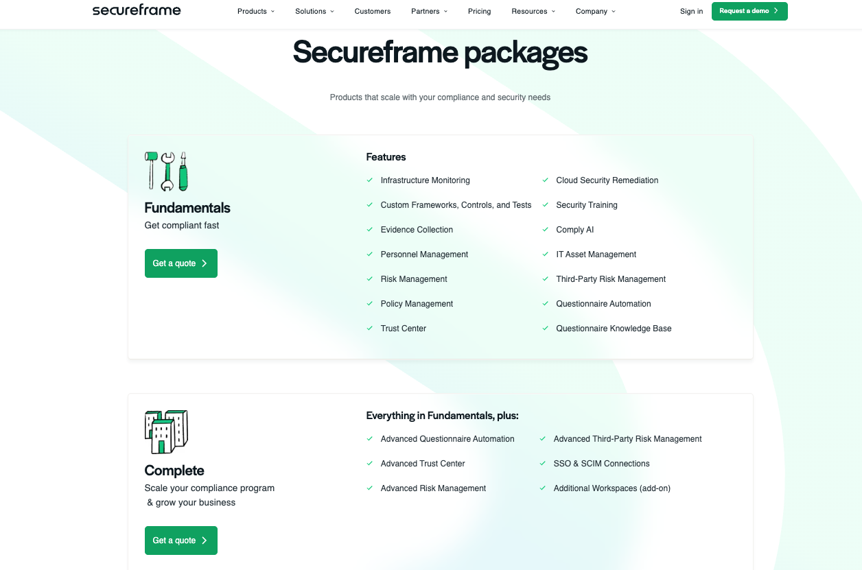 Secureframe offers AI-assisted compliance tools. Many startups begin with a one-time SOC 2 readiness assessment, essentially a structured and automated audit. Once complete, Secureframe nudges customers into a recurring plan for continuous compliance monitoring, evidence collection, and reporting. The initial audit proves the need, and the ongoing plan solves it.