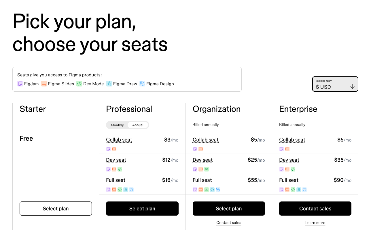 Figma is a collaborative design platform used by designers, developers, marketers, and product teams. Its pricing strategy includes: